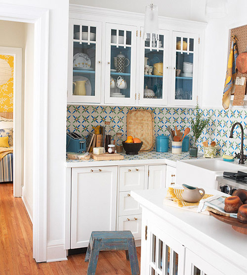 Kính cho phép mắt nhìn sâu vào bên trong tủ bếp, vì thế mà những bức tường có cảm giác xa hơn. Mẹo nhỏ này có hiệu quả nhất nếu bạn có thể sắp xếp đồ bên trong tủ gọn gàng, theo từng màu sắc. Sự lộn xộn đồng nghĩa với chật chội.