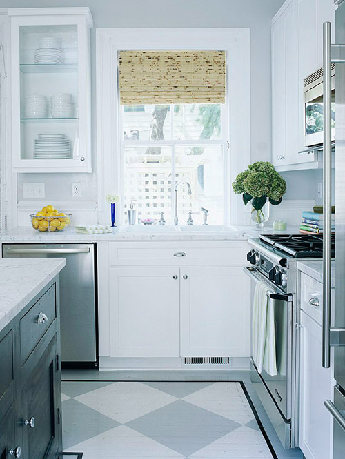 Một vài họa tiết giấy dán tường hoặc sàn nhà gây ra sự hỗn loạn về thị giác, là không gian đã nhỏ lại càng nhỏ hơn. Nhưng tất nhiên, một số kiểu họa tiết lại có tác dụng ngược lại. Họa tiết kim cương oversize trên sàn nhà tạo ra các đường chéo, mang lại cho mắt nhìn những đường thẳng dài hơn để theo dõi. Do đó, căn phòng cảm thấy rộng hơn thực tế. Kết hợp kỹ thuật này với những gam màu tương phản nhẹ để có được kết quả ưng ý trong một căn bếp nhỏ.