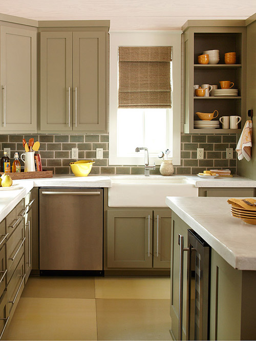 Ở đây, hệ tủ bếp, tường bếp và sàn nhà có chung một gam màu, đó là màu xám – xanh lá cây giúp mắt của chúng ta không bị choáng đột ngột khi chuyển từ vùng tối ra sáng.