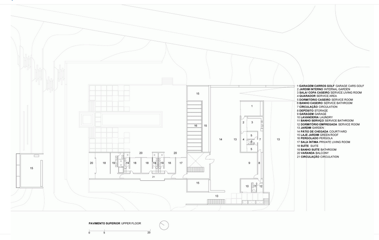 Tầng cao nhất, khu lối vào bao gồm phòng người quản gia, nhà để xe và khu vực phục vụ song song với đường phố. Tầng này được ngụy trang khéo léo bởi bức tường đá, cách xa đường phố và giúp cho khu vực có được không gian riêng tư cần thiết.