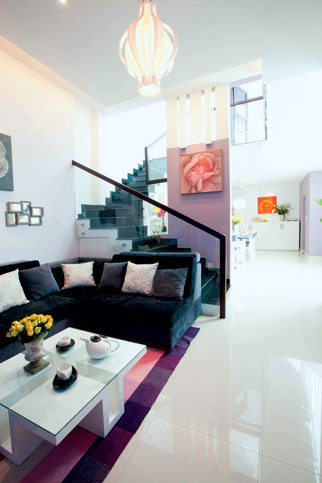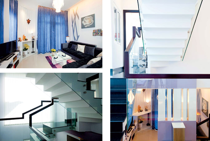 Màn cửa, trang trí tường lấy cảm hứng từ thiên nhiên, gần gũi nhẹ nhàng. Cầu thang bằng kiếng giúp không gian trở nên thoáng hơn.