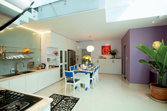 Thiết kế, đồ dùng nội thất hiện đại phù hợp với không gian mở cho nhà bếp, phòng ăn, phòng khách. Đa số các vật dụng đều ưu tiên màu trắng để không gian chung trở nên nhẹ nhàng.