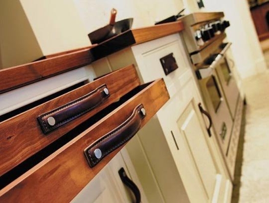 Căn bếp trở nên sang hơn nhờ những tay nắm tủ bằng da.