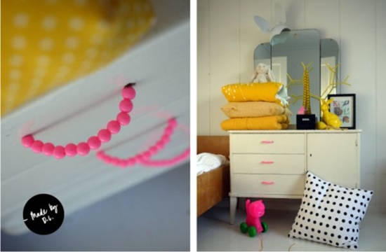 Bạn cũng có thể thay thế chiếc tay nắm tủ cũ kỹ bằng những hạt cườm rực rỡ, xinh xắn xâu bằng dây thép. Với ý tưởng này, chiếc tủ nhỏ của bạn sẽ trở nên cực kỳ hện đại và bắt mắt.