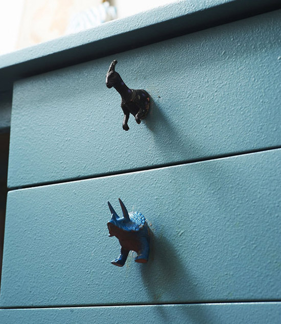 Chắc chắn những chiếc tay nắm ngộ nghĩnh hình thú này sẽ khiến con bạn thích mê. Hãy tận dụng những mô hình động vật cũ mà con bạn không chơi nữa để làm chiếc tay nắm tủ cho bé. Đây là một cách trang trí phòng bé thật đơn giản và thú vị.