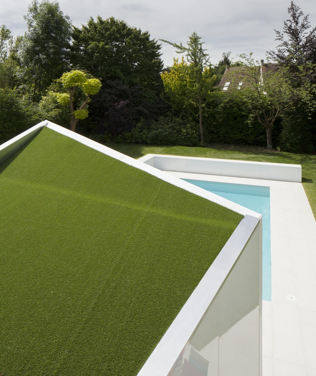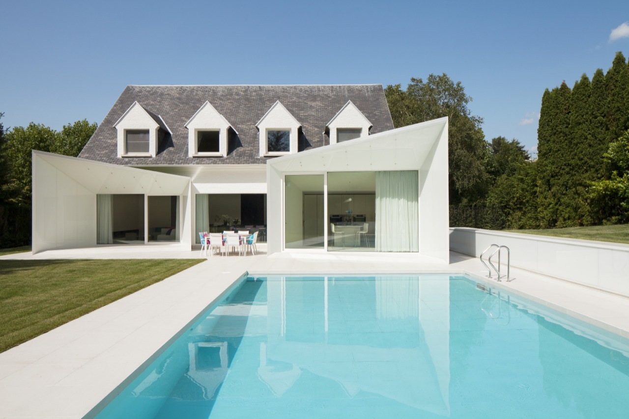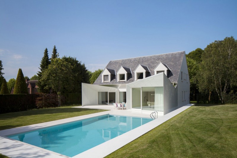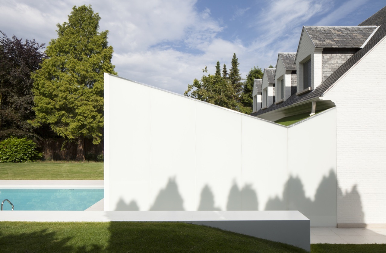 Kiến trúc sư giải thích: “Khách hàng đã đồng ý với thiết kế để có được giấy phép xây dựng đúng theo quy định xây dựng. Những quy định thật sự đã có tác động rất lớn đến thiết kế của biệt thự.” Bên ngoài của ngôi nhà được sơn toàn bộ màu trắng. Hồ bơi hiện tại đã được cải tạo đơn giản với hai khối lượng bổ sung được thêm vào nhằm tạo ra quá trình chuyển đổi liền mạch giữa nội thất và ngoại thất, kết nối ngôi nhà, hồ bơi và khoảng sân xanh tươi với nhau.