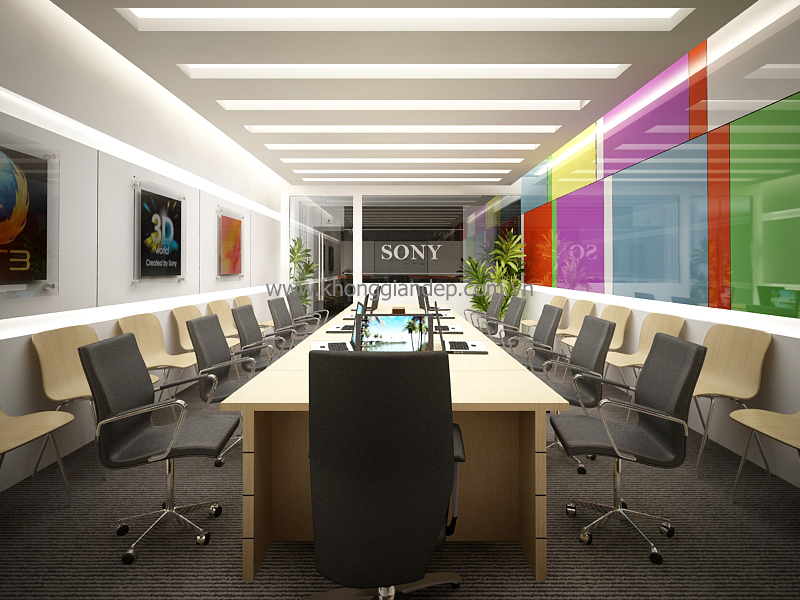 Phòng họp tinh tế và sôi nổi nhờ những mảng màu sắc rực rỡ kết hợp đầy ngẫu hứng.
