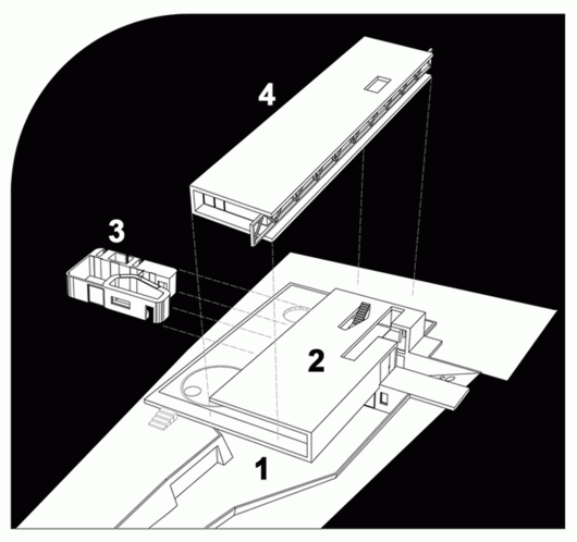 Khu vực dành cho khách nằm trong khu vực bê tông hình chữ C khác, hướng ra phía Đông để có thể đón được những tia nắng đầu tiên trong ngày và có tầm nhìn ra khu rừng gần đó. Như một khách sạn tư nhân, khu vực này bao gồm các phòng phân bổ số lượng người ở tự do và phụ thuộc vào tổng số khách và một không gian chung kết nối với không gian lưu thông theo chiều dọc. Bên ngoài, gạch men được đắp lên làm biến dạng quy mô tuyến tính của nó. Về mặt kết cấu, khu vực dành cho khách được hình thành bởi dầm dài 37 mét giúp tạo nhịp rộng và đặc trưng cho mặt tiền phía trước.