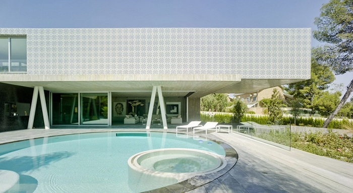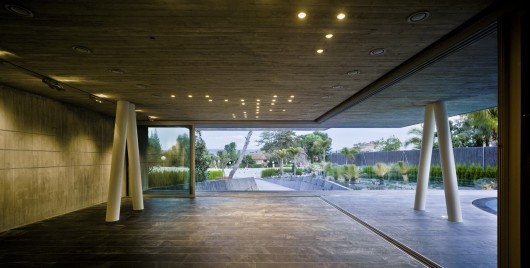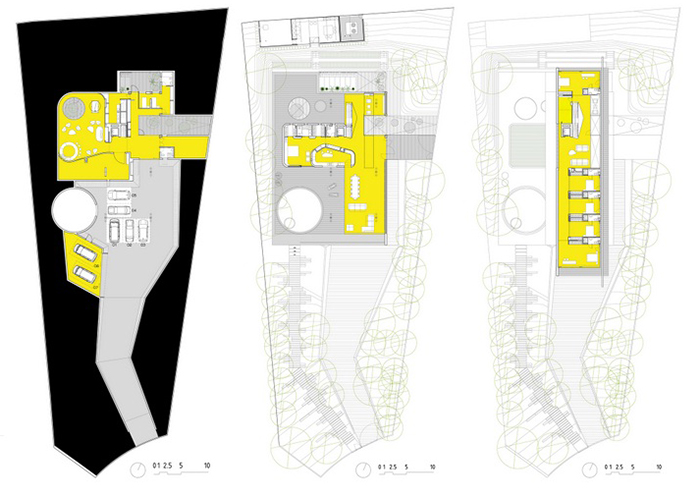 Tầng hầm được thắp sáng bởi hàng hiên và cửa sổ trần, đây chính là một phần mang chức năng giải trí. Niềm vui bắt đầu trong bãi đỗ xe, nơi có thể nhìn thấy hồ bơi từ một “cửa sổ phía sau”. Vỉa hè được làm bằng bê tông được đóng dấu nhằm kết nối ngôi nhà và khu đất. Trong khu vực này, dưới hình thức của một vết ngoằn ngoèo trên mảnh đất, đây được dành làm bãi đậu xe.