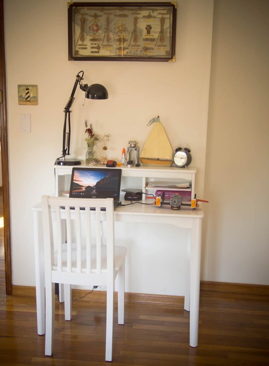 Khá may mắn là căn phòng đã được lát gỗ sẵn nên khi lật lớp thảm lên chỉ cần vệ sinh sàn gỗ cho sạch và thay sửa một số tấm gỗ bị hỏng là đã có ngay một sàn nhà ưng ý. Bức tường cũng được sơn lại với màu trắng để tăng độ sáng cho căn phòng và phù hợp với phong cách thuỷ thủ. Khâu khó và mất nhiều thời gian nhất chính là chọn nội thất cho căn phòng. Bố mẹ Adrina đã phải tìm ở nhiều cửa hàng và hội chợ đồ cũ để mua được những món đồ ưng ý.