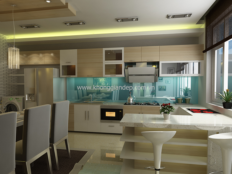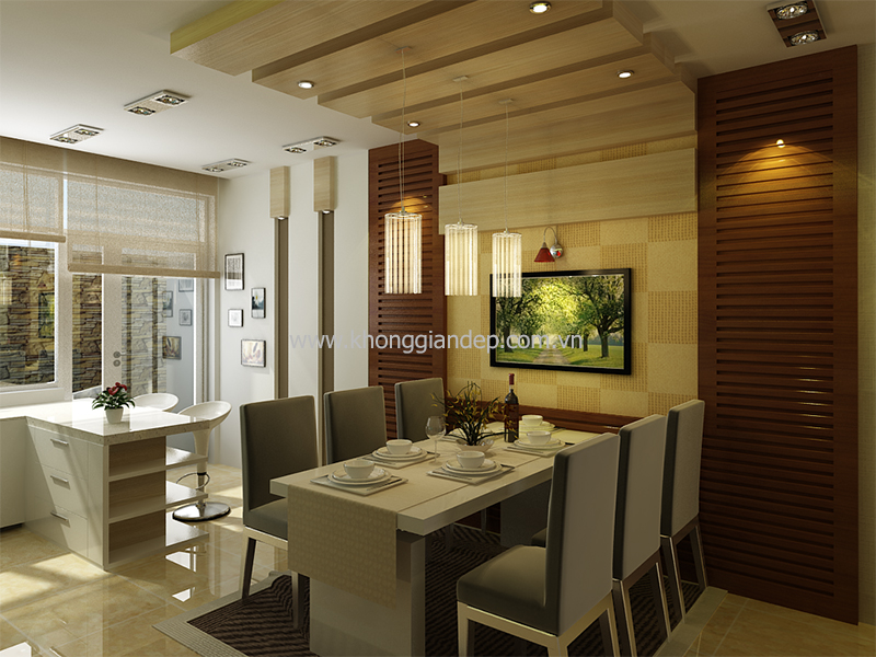 Thiết kế trần bằng những thanh gỗ kiểu chính là tạo ra một không gian ảo ngăn cách bếp và phòng ăn. Ngoài ra, ánh sáng trong phòng ăn cũng được sắp xếp hợp lý và đẹp mắt.