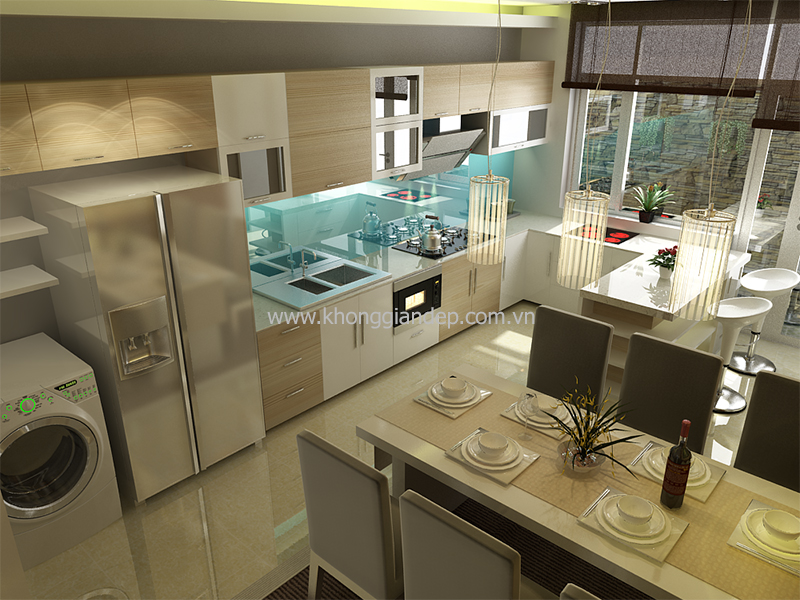Căn bếp kiêm phòng ăn mang đầy đủ chức năng với nội thất gỗ và sàn màu nâu nhạt chủ đạo, giúp gia đình có những bữa cơm ấm cúng cùng nhau.