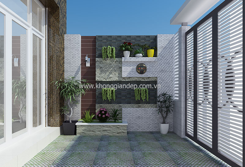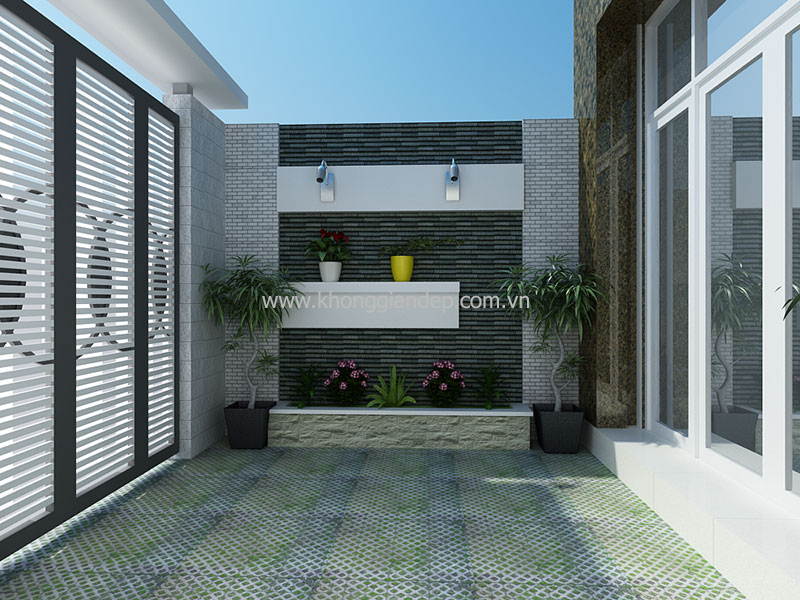 Để cho ngôi nhà phố bớt nhàm chán và khô cứng, một góc sân trước được thiết kế làm chỗ đặt những chậu hoa xinh tươi.