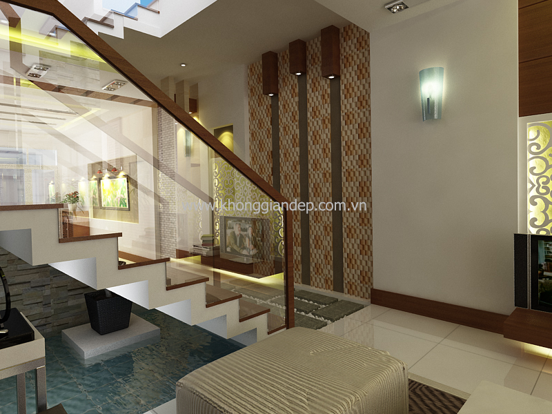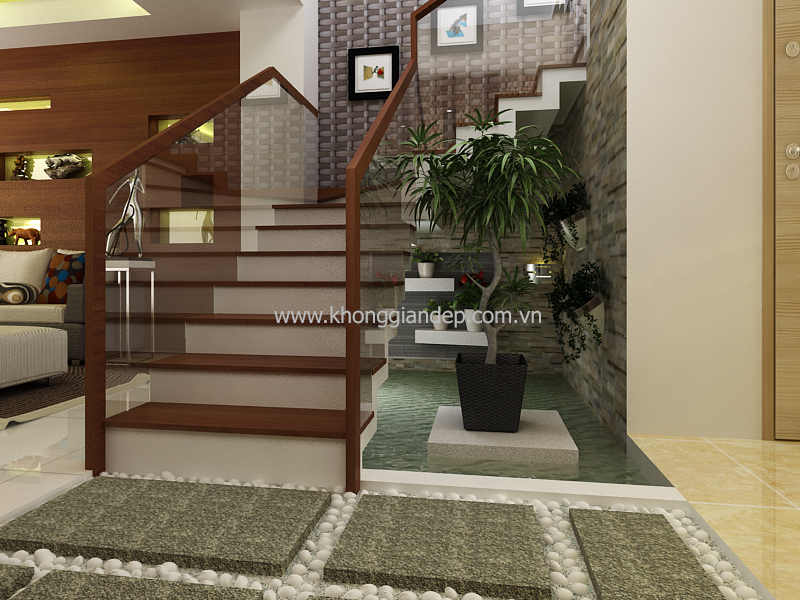Dưới chân cầu thang được tận dụng làm hồ nước, cùng với cây xanh cũng được đặt vào giúp tăng thêm sinh khí và tài lộc cho gia đình.