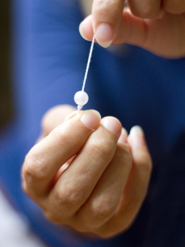 Sau khi luồn qua thắt nút đầu còn lại tránh để hạt trang trí tuột khỏi kim.
