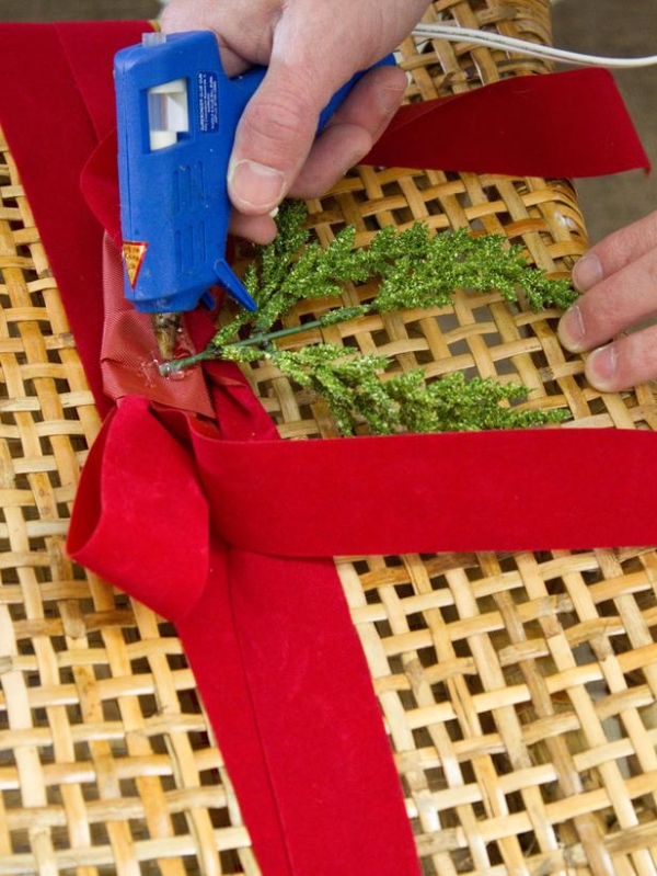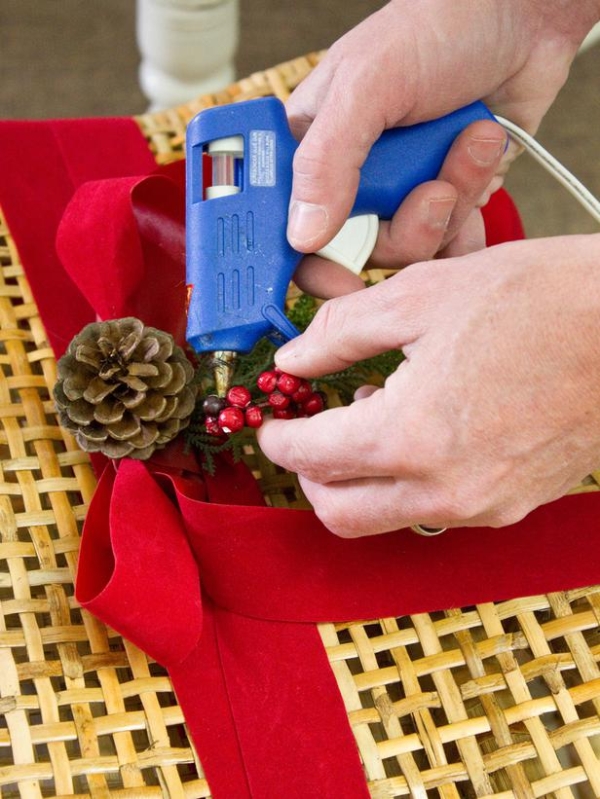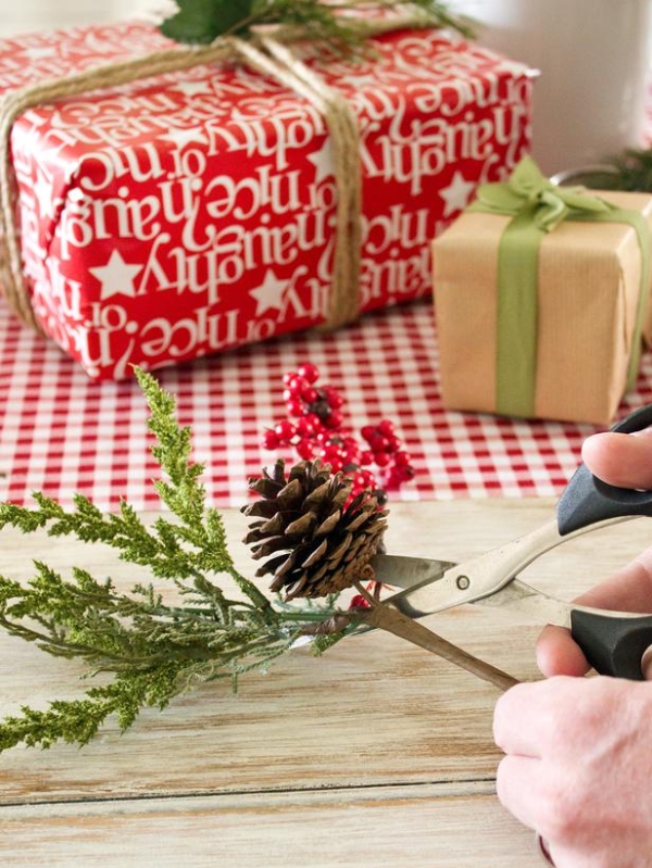 Sử dụng kéo cắt thêm các chi tiết trang trí như cành thông hoặc quả thông.