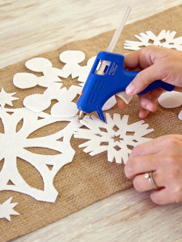 Đính kèm các góc và các trung tâm của bông tuyết để vải bố với dấu chấm nhỏ keo nóng.