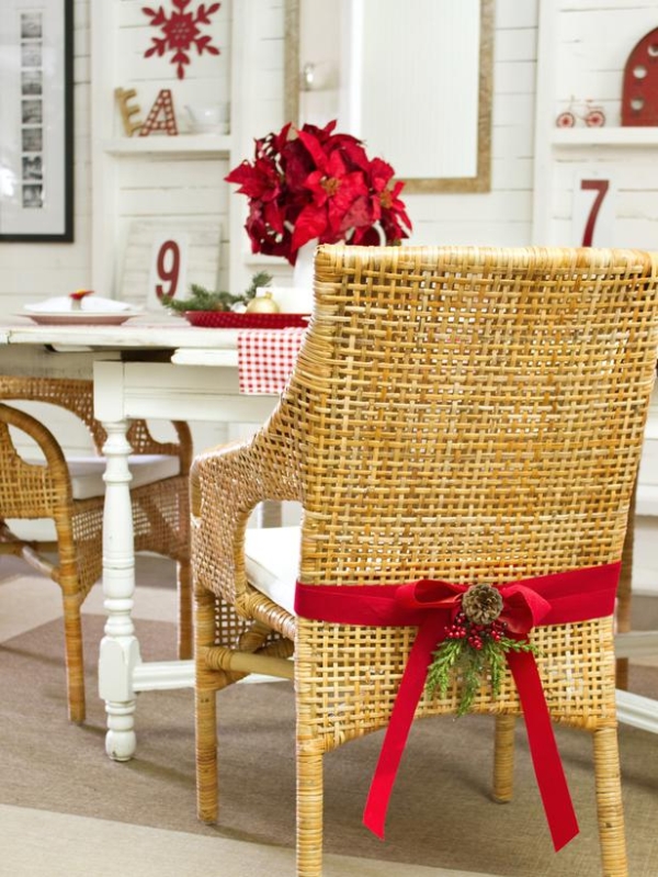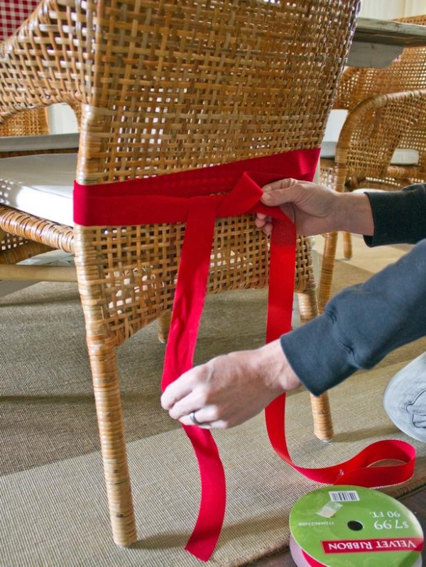 Bắt đầu và kết thúc ở mặt sau của ghế, quấn một dải ruy băng xung quanh mặt sau của mỗi ghế ăn hai lần. Buộc lỏng lẻo ở trung tâm của ghế, để lại một chiều dài dài của băng trên cả hai mặt.