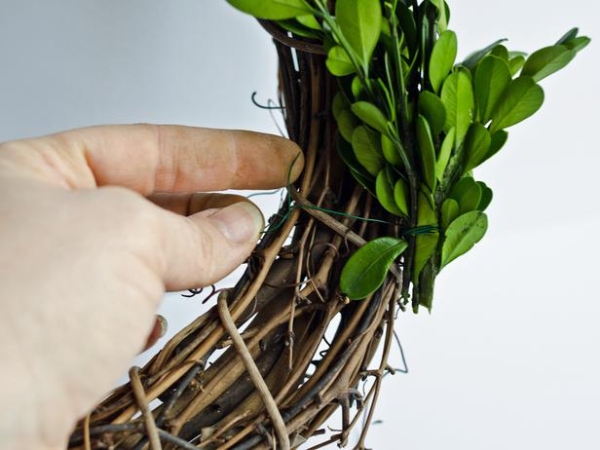 Lặp lại với các hàng tiếp theo, cho phép chùm để chồng lên nhau bởi một vài inch. Lặp lại quá trình này cho đến khi mặt trước của vòng hoa được đảm bảo.