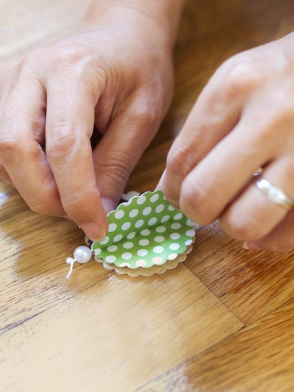 Sau khi buộc xong hạt trang trí nhỏ băng keo hoặc băng dính vào mặt sau hình tròn và thả hạt trang trí vào sau đó gấp chúng lại.