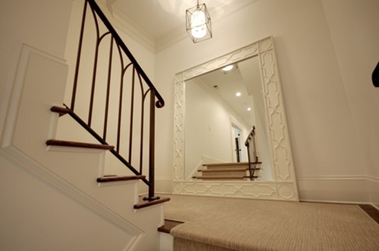 Chiếu nghỉ cầu thang là một trong những nơi thích hợp để bạn bố trí một tấm gương. Ngoài những hiệu ứng về thị giác cho không gian, bạn có thể soi gương, chỉnh lại trang phục ở khu vực này.