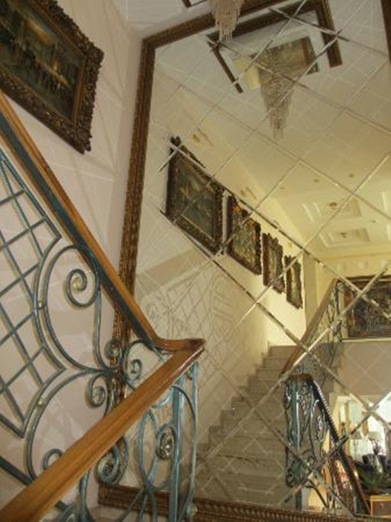 Chiếc cầu thang hẹp trở nên rộng hơn nhờ tấm gương to bản với những đường vân độc đáo.