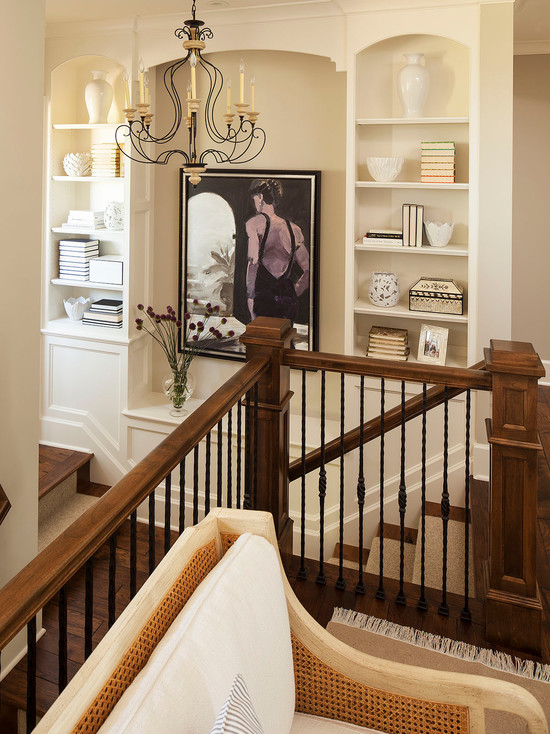 Một chiếc tủ âm tường nhiều ngăn quả là một kho lưu trữ sách tuyệt vời. Bạn có thể sắm thêm một chiếc ghế gấp gọn để biến chiếu nghỉ cầu thang thành nơi đọc sách cực kỳ tiện lợi.