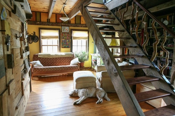 Không có chỉ có ngoại cảnh đẹp, bên trong nhà cũng rất tiện nghi và đẹp mắt với phong cách dân gian pha lẫn kiến trúc Gothic độc đáo và mời gọi. Phòng khách với những họa tiết bắt mắt theo phong cách dân gian. Ánh sáng từ cửa sổ và trần nhà chiếu xuống tăng thêm vẻ long lanh và chiều sâu cho căn nhà. Trên tường trang trí bằng những tấm áp phích hòa nhạc cổ điển.