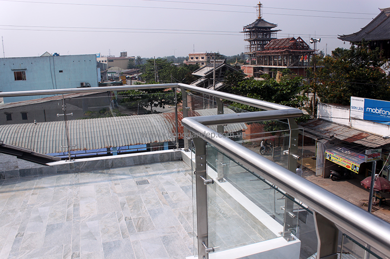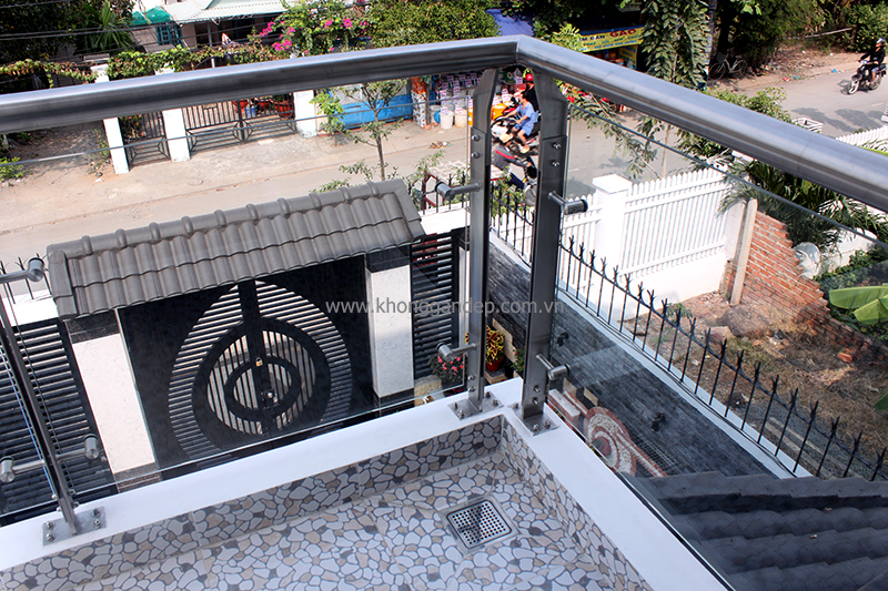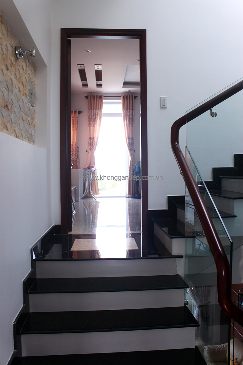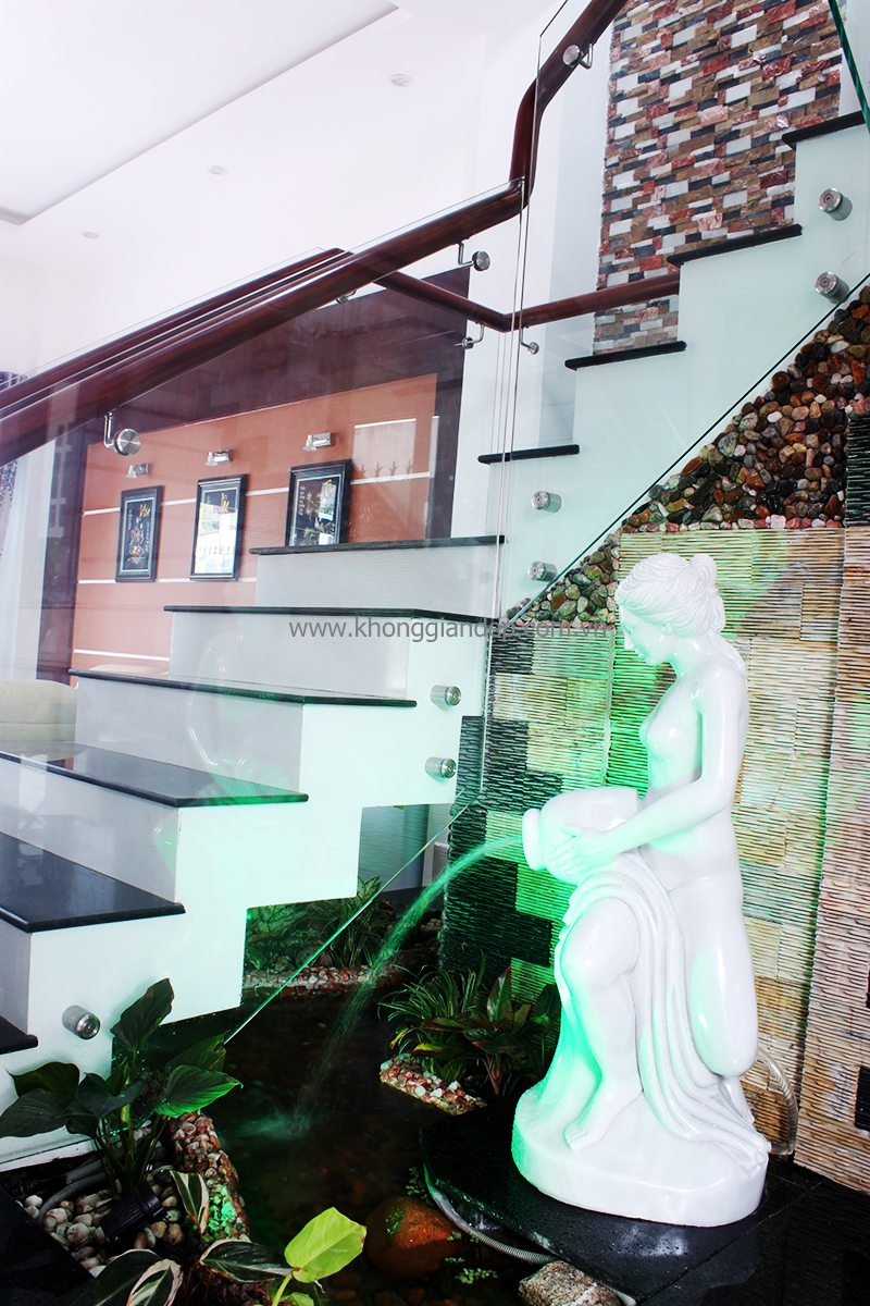 Cầu thang được lắp kính giúp tăng thêm cảm giác thông thoáng và sự quan sát cho người sử dụng từ trong nhà.