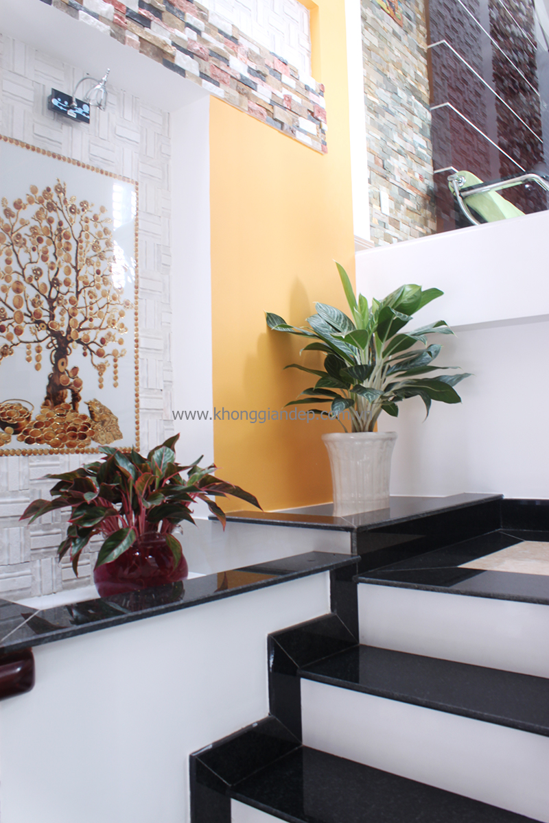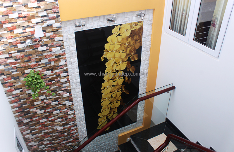Bức tranh hoa phong lan màu vàng rực rỡ trên nền đen chính là điểm nhấn cho bức tường cầu thang lên lầu hai