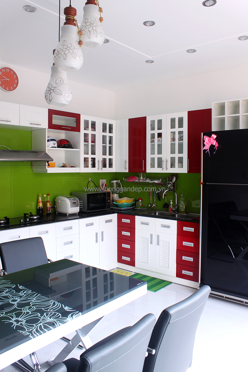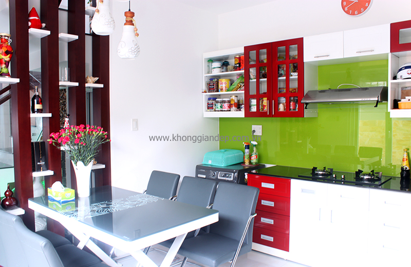 Những màu sắc rực rỡ được kết hợp hài hòa tạo nên gian bếp tươi vui và đầy sinh khí