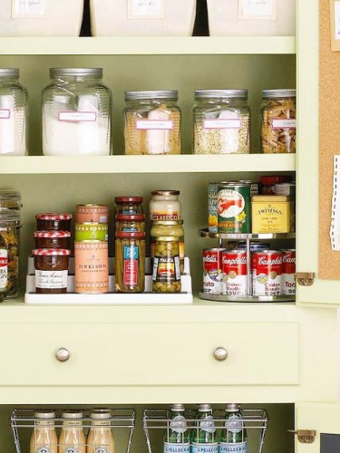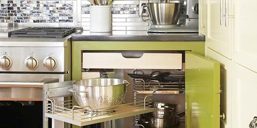 Để tối đa hóa không gian đằng sau cửa tủ bếp, kệ tầng và kệ lazy susan cho phép việc tìm kiếm và tiếp cận những món đồ nằm trong cùng dễ dàng hơn.