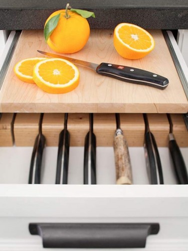 Bây giờ, hãy dành thời gian để nói về những gì diễn ra bên trong những ngăn kéo tủ và đằng sau những cánh tủ bếp. Tôi say mê với ý tưởng lưu trữ các công cụ cắt gọt thành nhóm bên trong các ngăn kéo. Cách này không chỉ giải phóng không gian bề mặt bếp mà còn giảm nguy cơ gây tổn thương cho con người.
