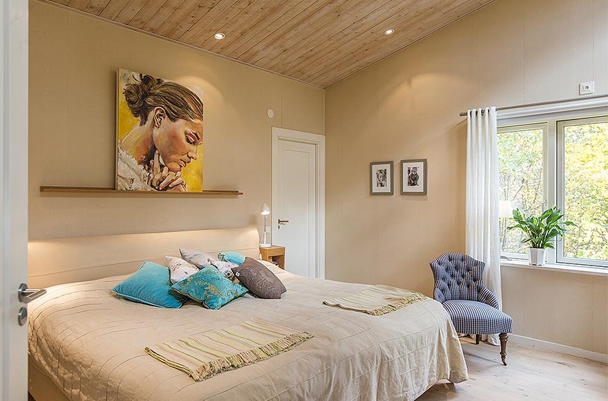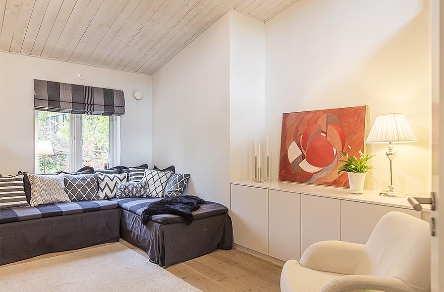 Ngoài ra, căn biệt thự có thiết kế nội thất nhỏ gọn và sang trọng mang những màu mật ong cấp độ khác nhau tạo cảm giác ấm áp. Từng chi tiết nhỏ đã được sắp xếp cẩn thận để tạo ra không gian thông thoáng điển hình cho kiểu nhà Thụy Điển và cũng để làm nổi bật đồ nội thất. Kết quả ấn tượng là một ngôi nhà tinh tế và ấm cúng.