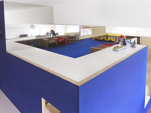 Phía trên chiếc hộp màu xanh có bàn làm việc xung quanh và các không gian đa năng cho trẻ em chơi , đọc hoặc vẽ .