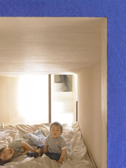 Phòng riêng của bố mẹ và các con chính là hai chiếc hộp gỗ làm bằng gỗ và phủ một lớp dạ màu xanh coban tươi sáng, được đặt chéo nhau.