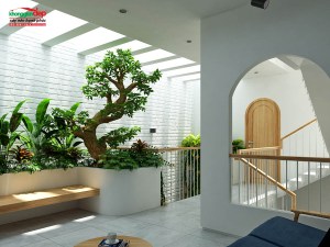 ♦ Yêu cầu thiết kế : bố trí nhiều công năng Phòng khách, bếp, phòng ăn, phòng thờ, 6 phòng ngủ, không gian đọc sách, phòng giặt. Tất cả các phòng đều được bố trí để lấy nahs sáng và thông gió tự nhiên.