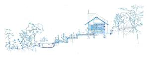 Dự án sử dụng các cấu trúc và vật liệu nhỏ, nhẹ ở gần và dễ tìm thấy xung quanh khu vực, có ít tác động đến môi trường tự nhiên xung quanh. Ngôi nhà có khung gỗ, chủ yếu được tạo từ các tấm bên trong và bên ngoài, kết hợp với các tấm chắn dạng thanh, giúp bảo vệ khỏi ánh nắng mặt trời.